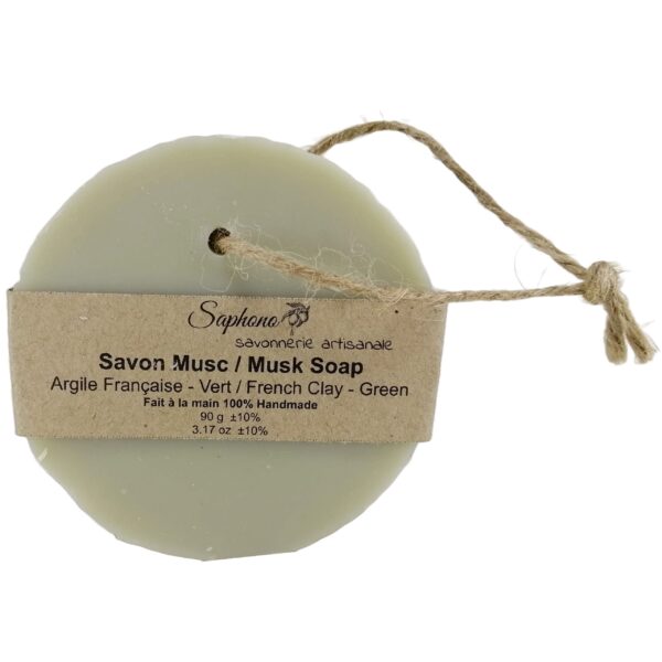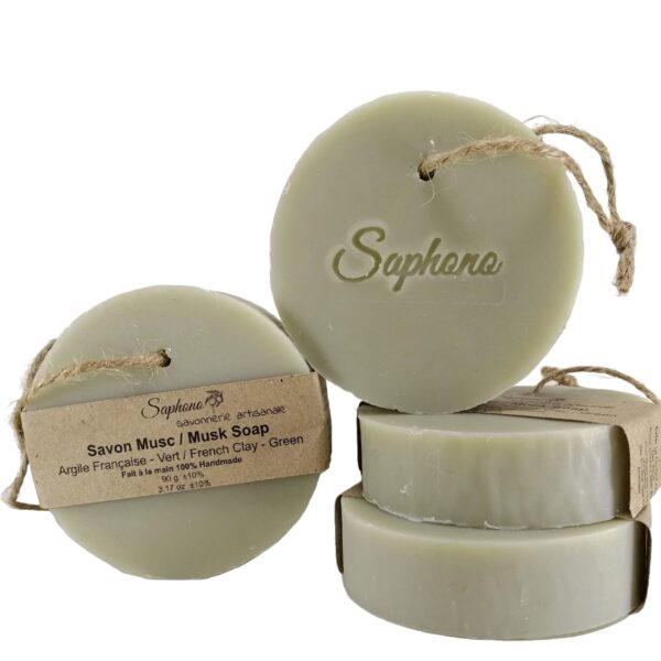 Soap infused with musk oil and French green clay offers a luxurious and beneficial cleansing experience.