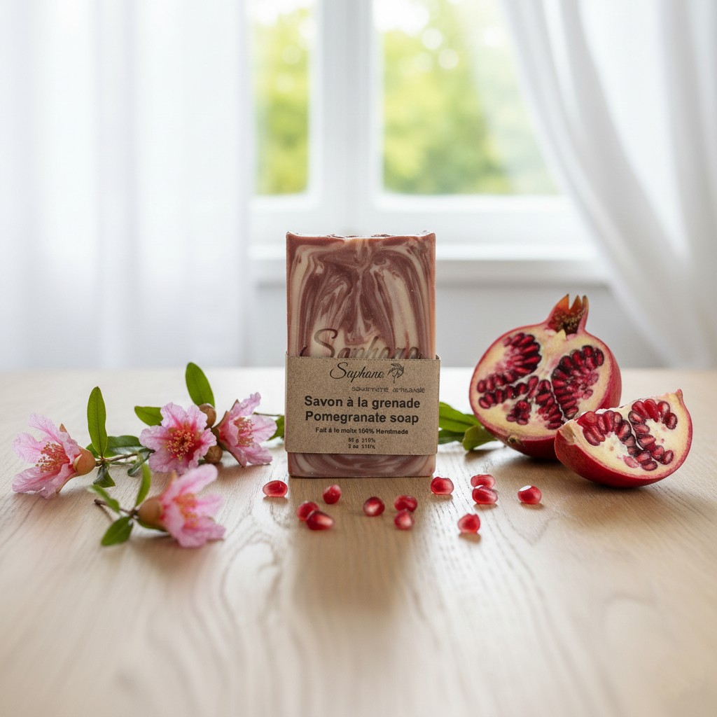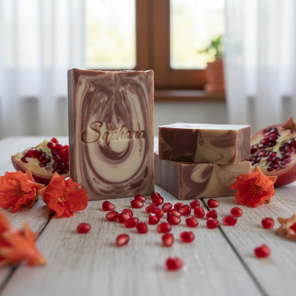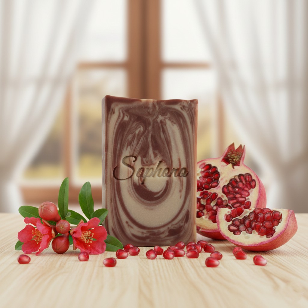 A soap enriched with pomegranate oil, olive oil, coconut oil, and castor oil would likely be a luxurious treat for the skin. Here’s a description: