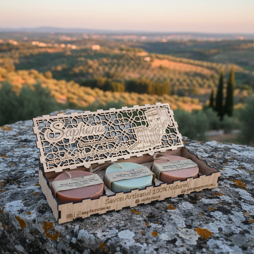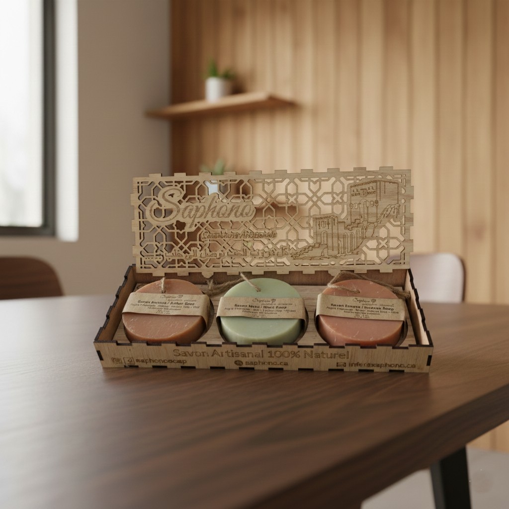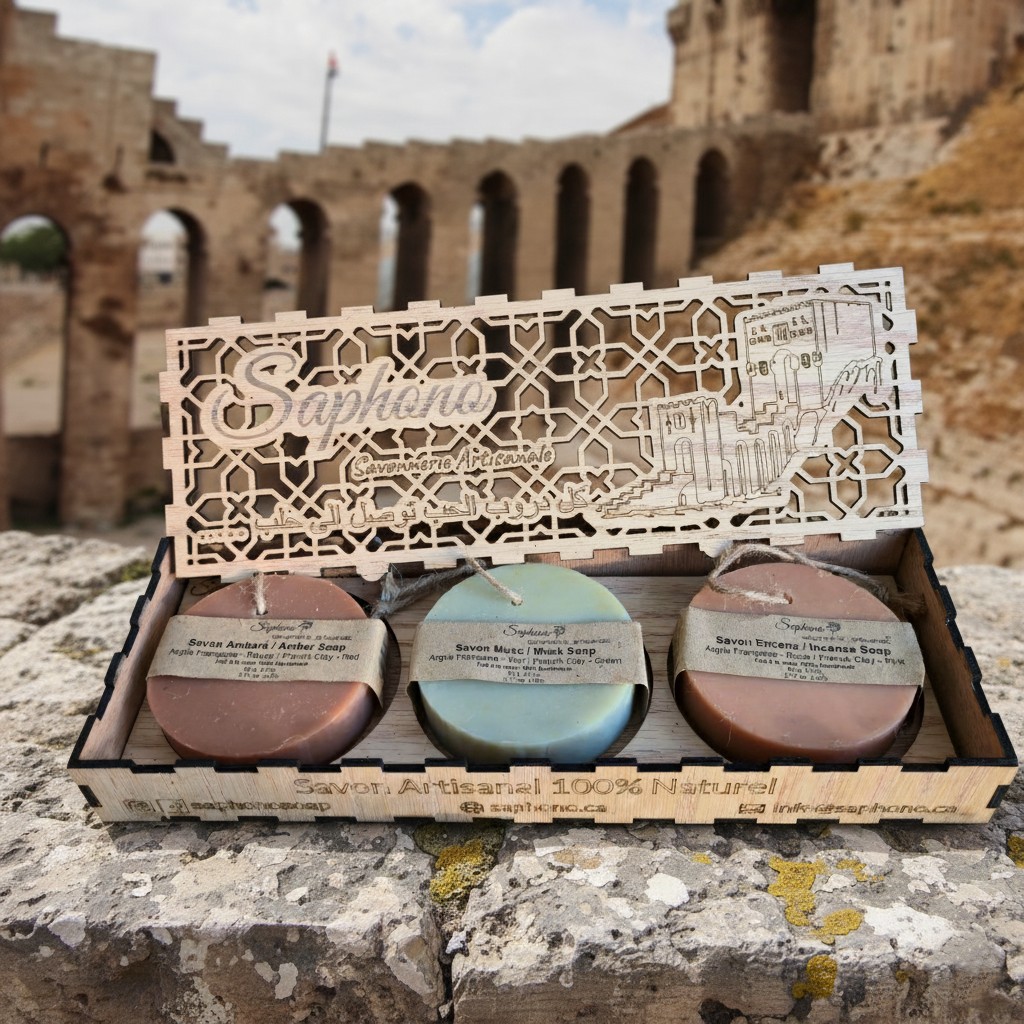 This Saphono Aleppo Citadel Gift Set features three artisanal soap bars, handcrafted in Canada using the authentic, centuries-old Syrian cold-process method.
